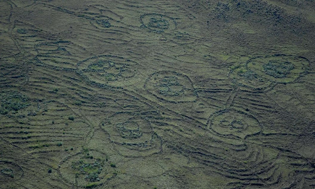 Part of the southern system of stone-lined enclosures. Image by Hamo Sassoon. “At a distance, the extreme regularity and precision of the paths and terraces is strangely reminiscent of an amphitheater.”